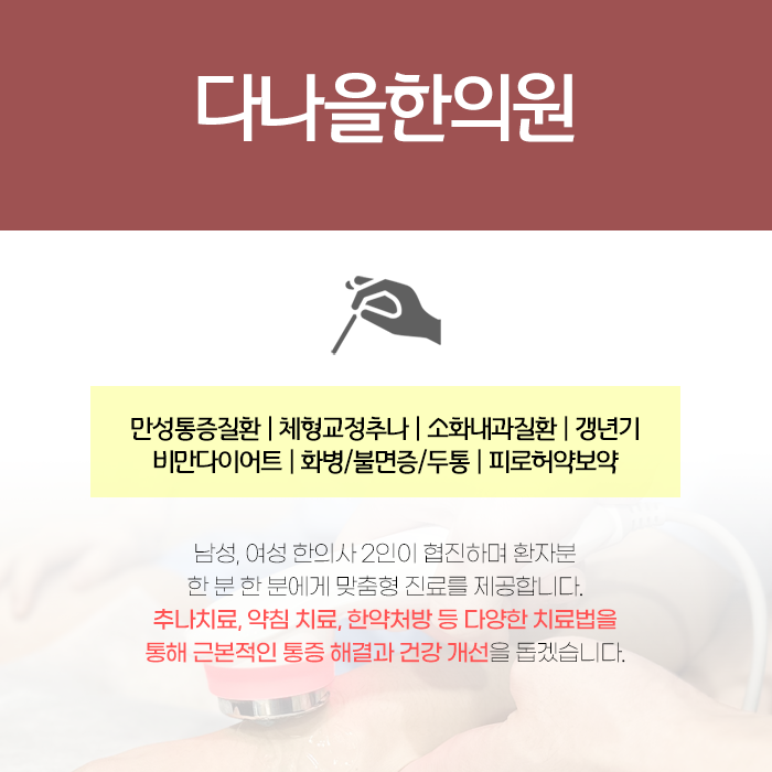 만성 기침은 폐와 기관지 기능 저하로 판단됩니다. 폐와 기관지는 호흡기의 중요한 부분으로 기능이 저하되면 효자동기침을 비롯한 다양한 증상이 발생할 수 있습니다. 손상된 신체 기능을 회복하고 면역력을 증진해야합니다. 이를 통해 기침 증상을 개선하고 재발을 방지하는 데 중점을 둬야합니다.