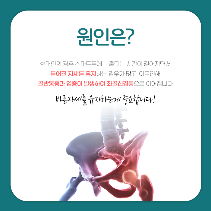잘못된 자세로 장시간 앉아 있는 습관은 허리와 엉덩이에 불필요한 압력을 가해 통증을 악화시킬 수 있습니다. 증상은 초기에는 미미하게 시작되지만 시간이 지남에 따라 점차 심해질 수 있습니다. 심한 경우에는 다리의 감각이 둔해지거나 걷는 데 어려움을 겪기도 합니다. 효자동좌골신경통은 허리에서 다리까지 이어지는 통증으로 다양한 원인에 의해 발생할 수 있는 복잡한 질환입니다. 조기에 치료를 받고 생활 습관을 개선하는 것이 중요합니다.