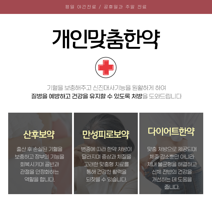 바쁜 일상 속에서도 건강을 챙길 수 있도록 하기 위해 평일 밤 9시까지 진료를 제공합니다. 늦은 시간에도 정성을 다해 각종 질환에 대한 진료와 그에 맞는 한방치료를 시행하고 있습니다. 평일에 바쁜 일정을 소화하는 분들도 주말을 이용해 편리하게 진료를 받을 수 있습니다. 신체의 이상을 느낀다면 시간을 미루지 말고 즉시 진료를 받는 것이 중요합니다. 조기에 치료를 받으면 후유증을 예방하고 건강을 회복하는 데 도움이 됩니다.