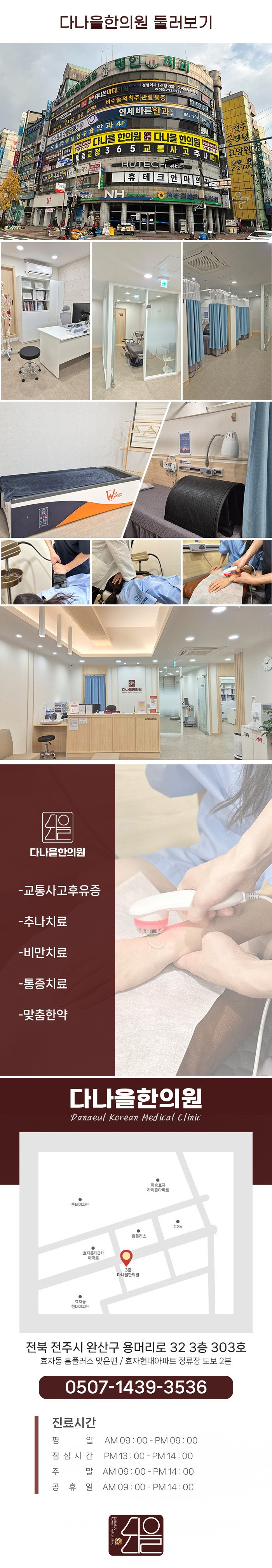 전주야간진료한의원에서는 바쁜 일상 속에서도 건강을 소홀히 하지 않도록 최선을 다하고 있습니다. 교통사고 관련 후유증 치료는 물론 다양한 분야를 다루고 있습니다. 특히, 교통사고 후유증은 여러 가지 복합적인 증상이 나타날 수 있기 때문에 초기 진단이 중요합니다.
