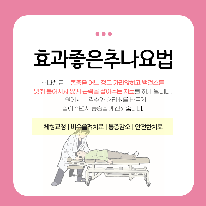 특히 한방요법은 의료진이 직접 뼈를 조정하는 수기 치료 방식으로 어긋나고 틀어진 신체를 바로잡는 데 효과적입니다. 전주효자동주말한의원 치료법은 별도의 약물 투여가 필요 없고 수술을 시행하지 않기 때문에 심리적 부담과 부작용이 없다는 장점이 있습니다.