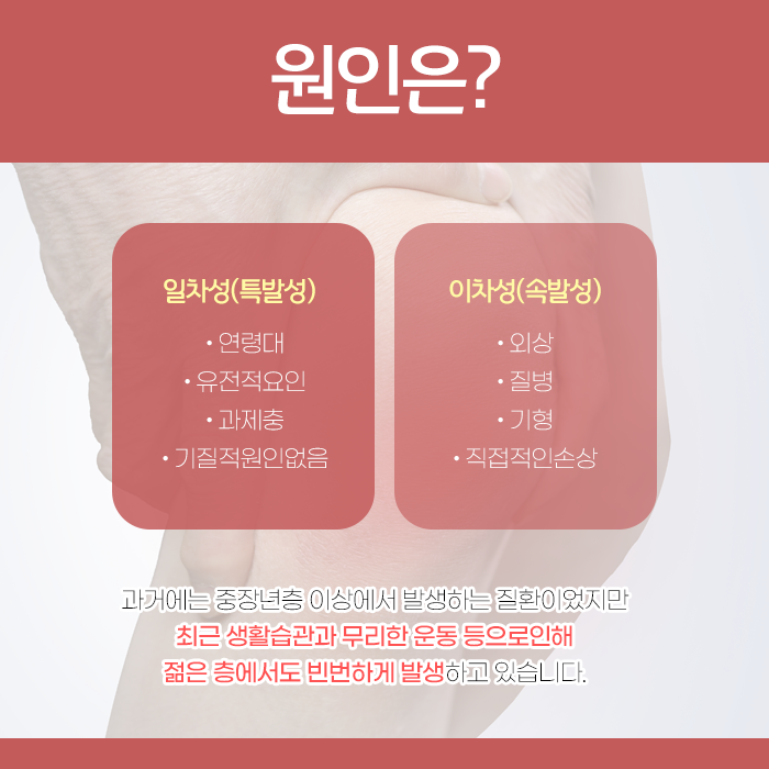 연골 조직에는 혈관이나 신경이 거의 없기 때문에 손상되더라도 스스로 복구할 수 있는 능력이 제한적입니다. 한번 발병하면 완치하기보다는 질환의 진행 속도를 늦추고 통증을 효과적으로 관리하며 관절 기능을 최대한 오래 유지하는 것을 목표로 관리해야 하는 질환입니다.