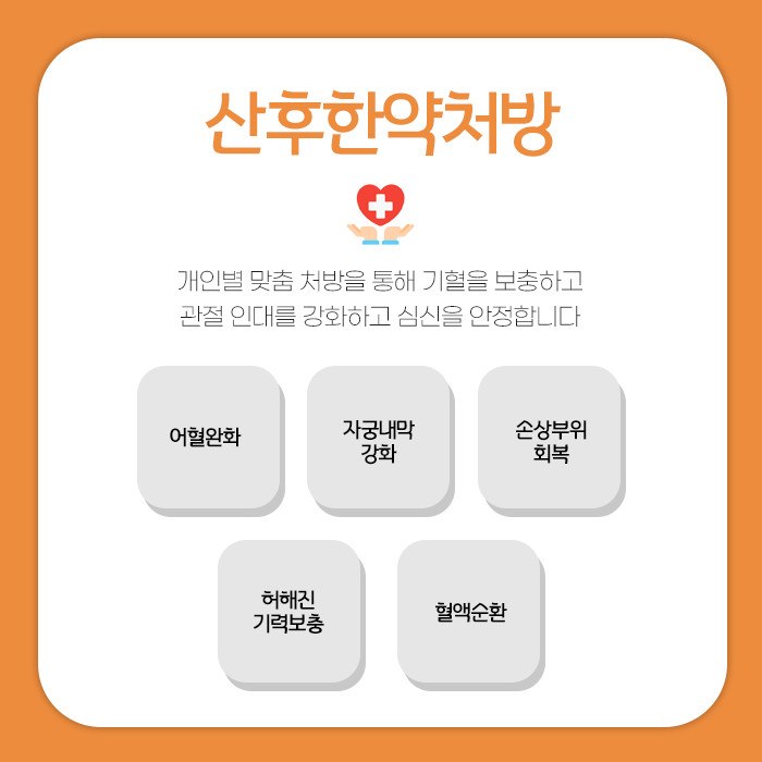 효자동산후보약은 출산 후 건강 회복에 중요한 역할을 합니다. 몸 전체적인 건강을 균형 있게 회복시키고 출산으로 인해 약해진 기운과 혈액을 보충하며 자궁 안에 남아 있거나 몸 전체에 정체된 어혈을 효과적으로 제거하는 데 도움받을 수 있습니다. 효자동산후보약 복용과 더불어 다양한 한방치료를 병행한다면 더 빠른 회복을 기대할 수 있습니다. 감사합니다.