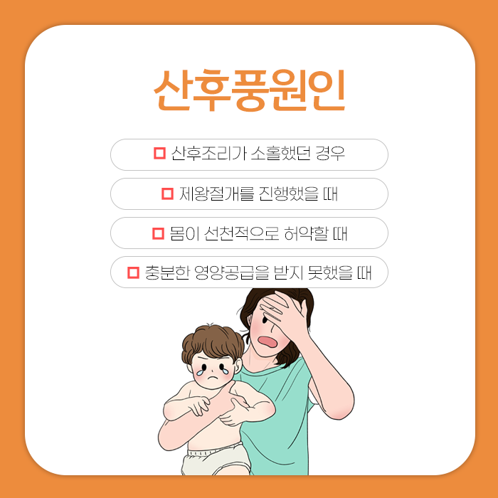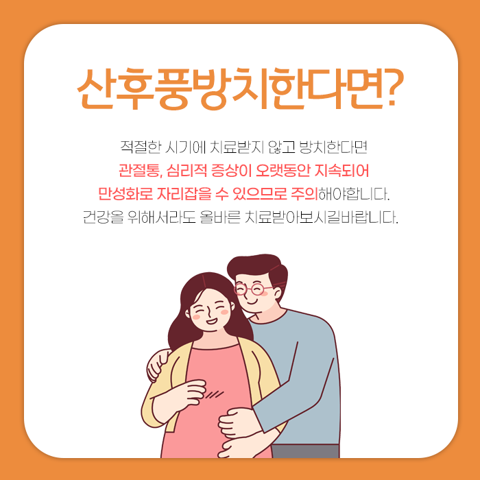 이 시기를 놓치면 어혈이 제대로 배출되지 않거나 몸의 회복이 불완전하게 이루어져 산후풍 발생 위험이 높아지거나 만성적인 건강 문제로 이어질 수 있습니다. 몸조리 없이 방치하게 되면 몸 안에 어혈이 제대로 풀리지 않고 쌓여 여성 질환으로 이어질 수도 있으므로 주의하셔야 합니다.