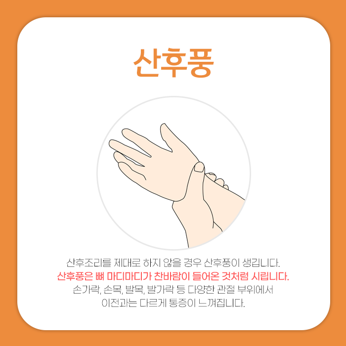 임신 중 늘어났던 인대와 관절이 제자리를 찾고 출산 시 소모된 기혈을 보충하며 자궁이 원래대로 수축하는 등 회복을 위한 중요한 시기를 거칩니다. 출산 후에 다양한 불편함을 경험하시는데 증상들을 통칭하여 산후풍이라고 합니다. 산후풍은 출산으로 약해진 몸 상태에서 복합적으로 작용하여 발생하는 여러 가지 증상들을 포함합니다.