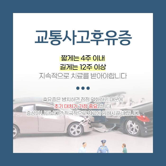 후유증이 무서운 이유는 겉으로 보이는 피부 상처나 골절 같은 외상이 없더라도 사고 충격이 몸 안쪽까지 전달되어 미세한 손상이나 어혈, 염증이 일어났을 가능성이 높기 때문입니다. 겉으로는 멀쩡해 보여도 몸 안은 다를 수 있습니다. 눈에 보이지 않는 손상이 점차 악화되어 시간이 지난 후 심각한 후유증이 나타나거나 후유증이 더 깊어질 수 있습니다.