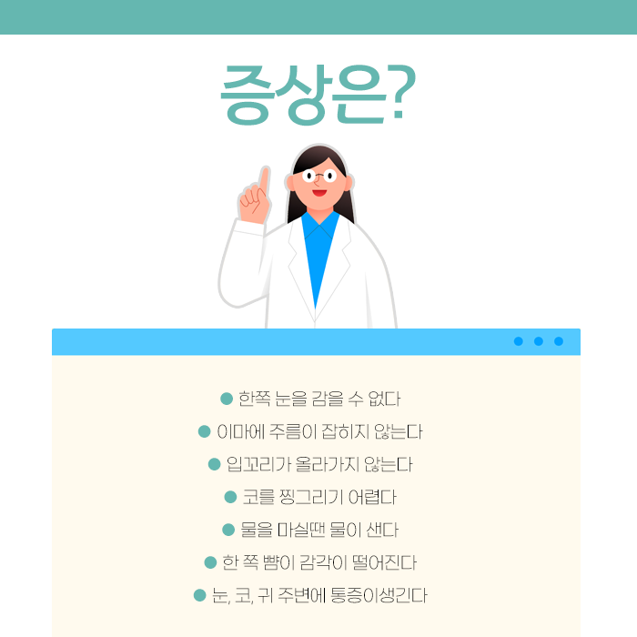 바이러스 감염, 면역력 저하, 스트레스 등과 관련이 있다고 추정됩니다. 얼굴의 한쪽 전체에 마비가 나타납니다. 눈이 잘 감기지 않아 눈물이 흐르거나 건조해질 수 있고 입꼬리가 처져 음식물이 새거나 발음이 부정확해질 수 있습니다.