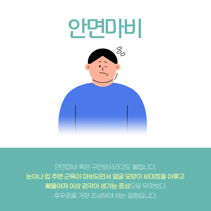 얼굴 균형이 틀어지고 비뚤어지는 등 안면 부위 비대칭을 경험하면 불안감을 느끼실 수 있습니다. 안면마비, 구안와사라고 불리는 질환은 얼굴 근육의 움직임을 담당하는 뇌신경에 문제가 발생하여 나타나는 질환입니다. 얼굴 표정, 눈물샘, 침샘 등을 조절하는 중요한 역할을 합니다.