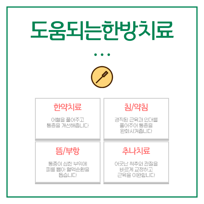 특히 신경, 근육, 관절의 조화를 이루게 하여 손상된 부위의 기능을 회복하고 원래의 움직임을 되찾을 수 있도록 돕습니다. 교통사고 후유증은 방치하면 만성화되거나 재발할 가능성이 높습니다. 한방치료는 어혈제거, 기혈순환 개선, 신체 불균형 교정을 통해 후유증의 원인을 개선을 기대할 수 있습니다. 사고 충격으로 인해 흐트러진 균형을 바로잡고 면역력을 강화하며 신진대사를 활성화하여 몸 전체의 활력을 되찾아줍니다.