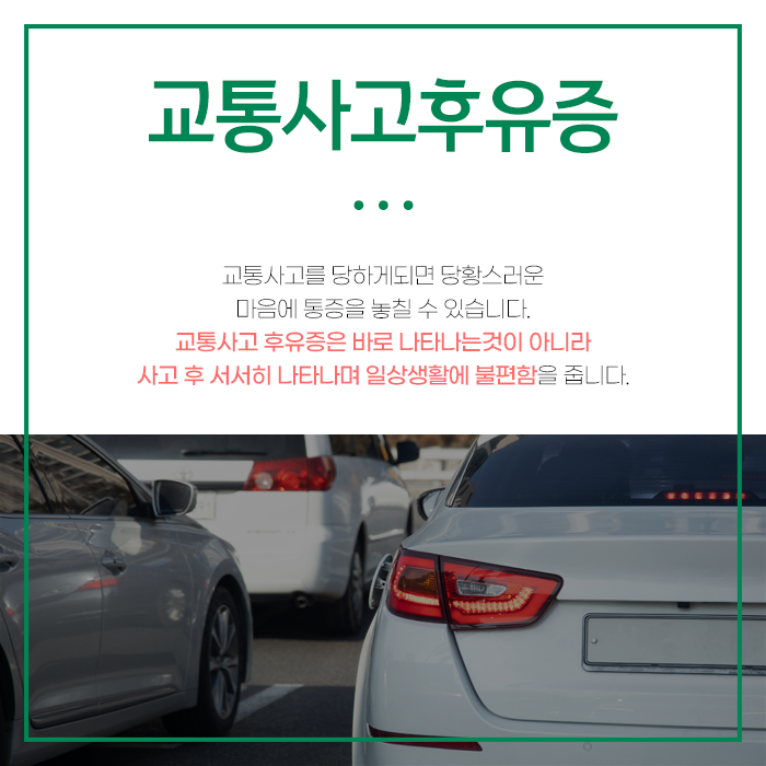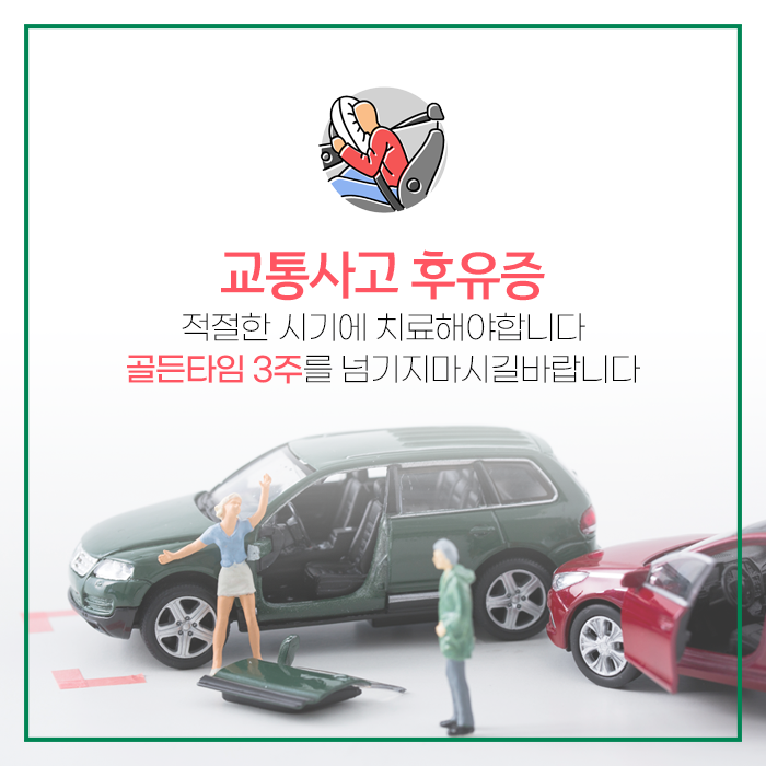 교통사고 후유증은 초기 치료가 중요합니다. 교통사고는 그 충격의 강도나 겉으로 보이는 외상 여부와 상관없이 몸에 예측 불가능한 영향을 미칩니다.