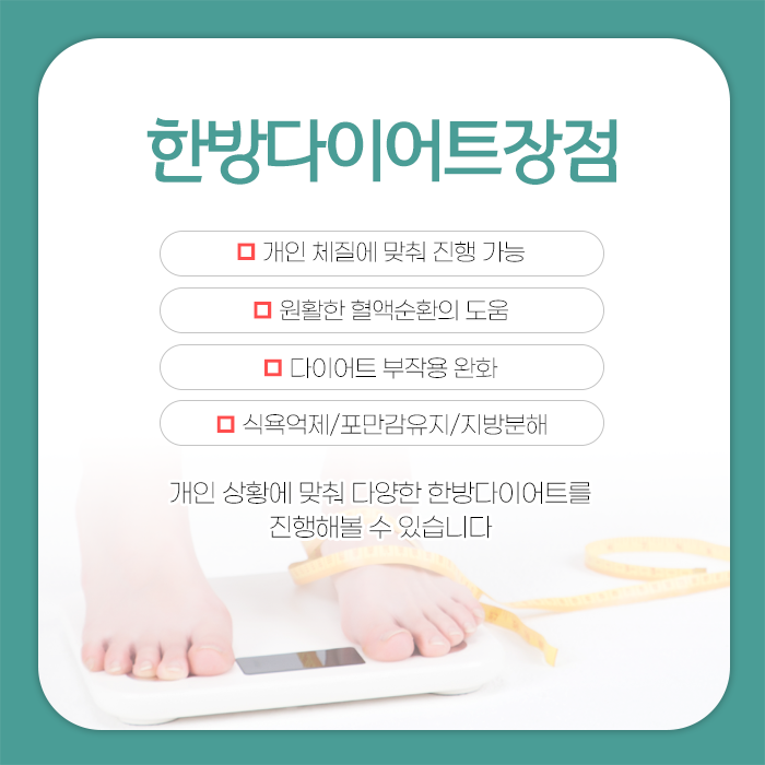 건강을 위해 시작한 다이어트가 다양한 부작용을 초래하여 몸과 마음의 건강을 해치는 결과를 가져올 수 있습니다. 효자동 다이어트한의원 무엇보다 체질, 체지방량, 근육량, 살이 찌는 원인을 충분히 파악하지 않은 상태에서 남들이 해서 효과 봤다는 다이어트 방법을 무작정 따라 하거나 무리하게 식사량을 제한하는 다이어트를 시작한다면 성공하기 어려운 경우가 많습니다.