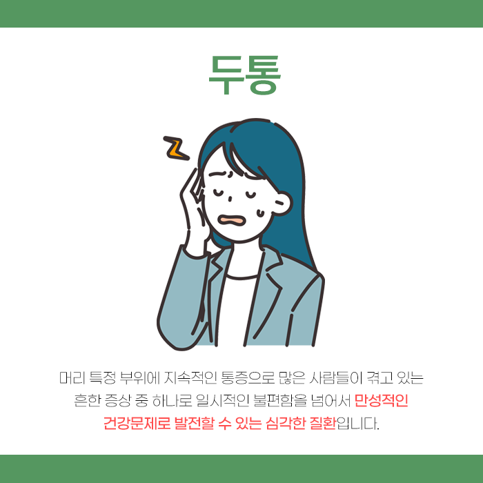 셀 수 없이 많은 크고 작은 스트레스에 끊임없이 노출되고 있습니다. 적절히 해소되지 못하고 과도하게 축적되면 다양한 건강 문제를 초래할 수 있으므로 관심과 관리가 필요합니다. 스트레스로 인해 가장 흔하게 나타나는 증상 중 하나가 두통입니다. 두통이 단기간에 사라지지 않고 수주 동안 지속된다면 적극적으로 증상 완화를 위한 방법을 찾아 대처하는 것이 중요합니다.