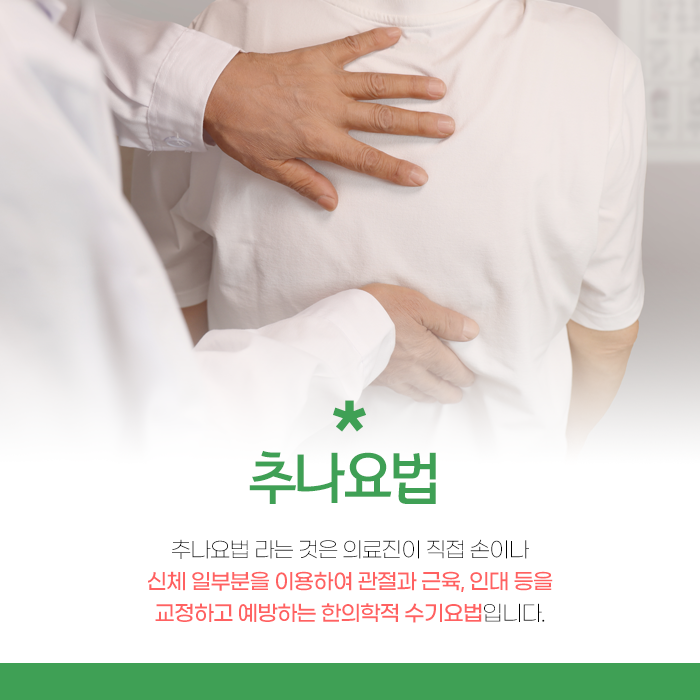 전주효자동추나요법은 제 위치에서 벗어난 뼈와 경직된 근육을 바르게 교정하여 아픈 곳을 편안하게 하고 척추 주변 조직의 기능을 순조롭게 해줍니다. 직접 손과 몸을 이용하여 진행하는 치료이므로 안전하면서도 부작용의 우려가 적다는 이점이 큽니다.