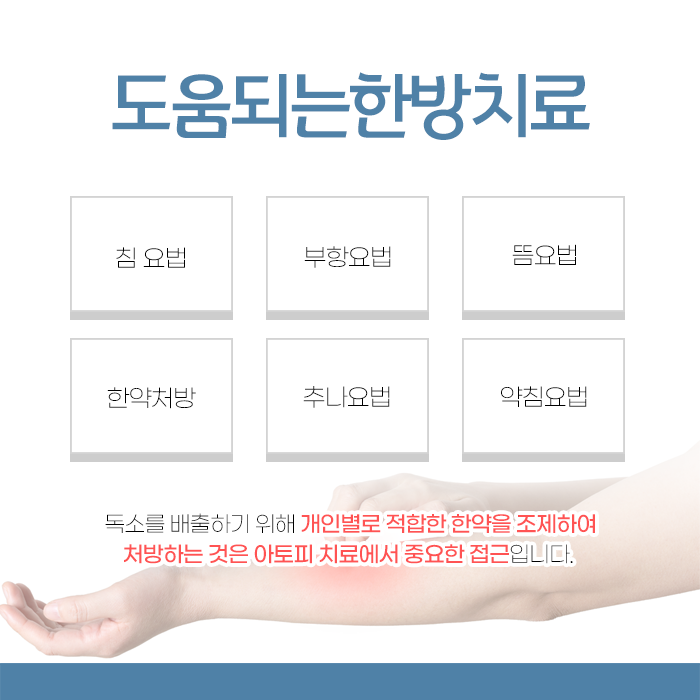 가급적이면 가려움증이나 피부 발진과 같은 전주아토피 증상이 나타난 초기에 치료를 받는 것이 필요합니다. 아토피가 발생하는 원인을 찾아내어 치료하는 데 중점을 둬야합니다. 체내에 쌓인 노폐물과 독소를 배출시키고 혈액과 기운의 순환을 방해하는 요인들을 제거하여 원활하게 만듭니다. 순환이 개선되면 피부로 영양분이 제대로 공급되고 염증 물질 배출이 용이해집니다.