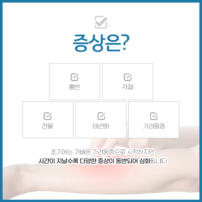 시기에 따라 커다란 영향을 받게 되는 사항 중 하나로 미세먼지와 황사 같은 자극으로 인하여 피부가 민감해져 악화되기도합니다. 극심한 가려움증은 가장 괴로운 증상 중 하나입니다. 낮에도 불편하지만 밤에는 가려움증이 더욱 심해져 잠을 방해합니다. 염증 반응으로 인해 피부가 붉어지고 크고 작은 좁쌀 같은 발진들이 올라옵니다.