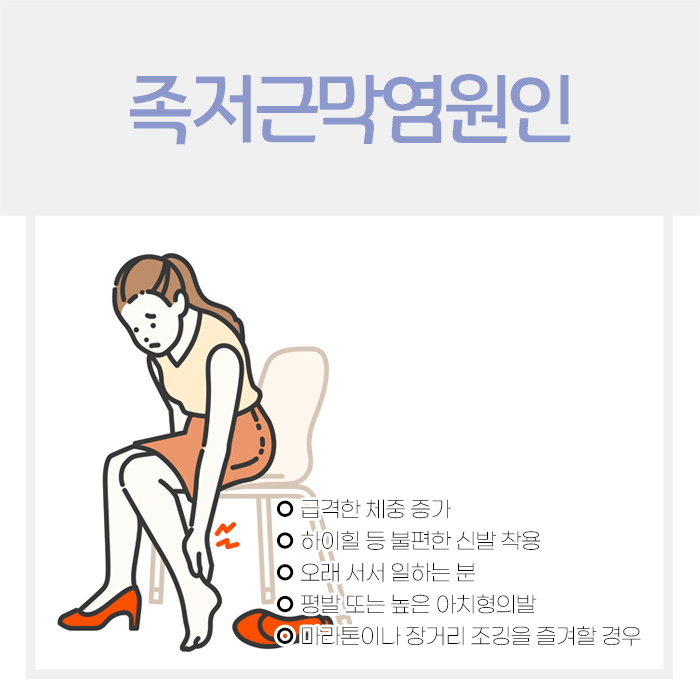 이 조직은 발 아치를 유지하고 걸을 때나 뛸 때 발에 가해지는 지면의 충격을 효과적으로 흡수하는 역할을 합니다. 하지만 오래 걸어 다니거나 장시간 서 있을 때 무리한 활동으로 인해 족저근막에 반복적으로 과도한 압력과 미세한 손상이 가해지면 이 조직이 스트레스를 받아 파열이 생기고 염증 반응이 유발됩니다.