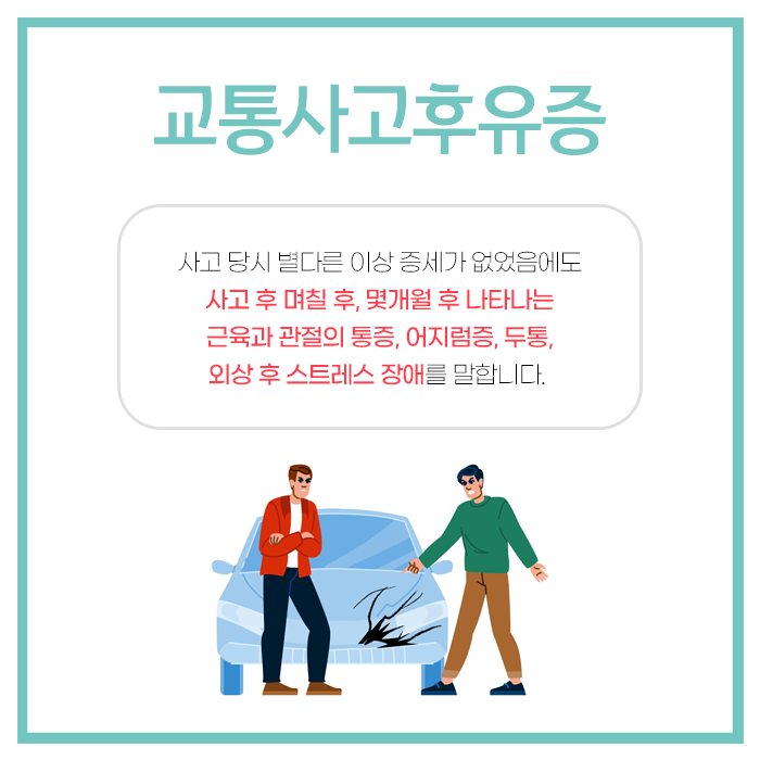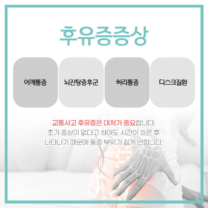 불의의 사고에 올바른 대응 방안을 알고 계시는 것이 좋습니다. 튼튼하니까 괜찮을 거야라고 생각하기 쉽습니다. 하지만 튼튼하고 건강한 분이라 할지라도 사고 충격으로 인해 몸에는 예상치 못한 변화가 생겨날 수 있습니다. 작은 충돌이라 할지라도 몸은 물리적인 충격에 민감하게 반응하여 인대나 근육에 미세한 손상을 입거나 척추의 배열이 틀어지는 등 문제가 쉽게 생길 수 있습니다.