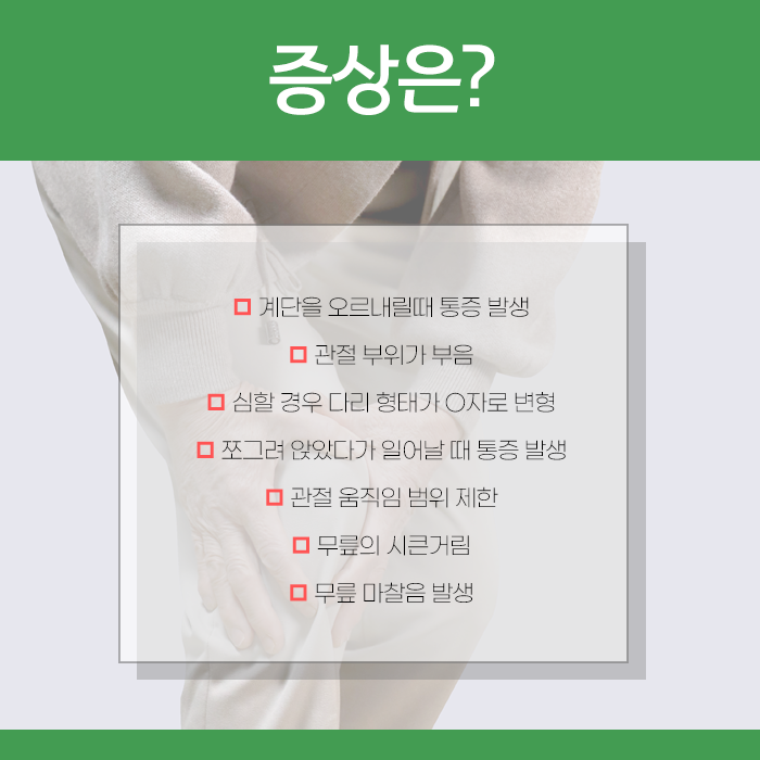 부종과 욱신거림이 동반될 수 있습니다. 관절 주위에 염증이 생기면 부풀어 오르고 불편함을 더합니다. 무릎에서 나는 마찰음이 있습니다. 관절 내부의 연골이 손상되어 뼈가 서로 마찰하는 소리입니다. 걸을 때 느끼는 통증과 힘이 약해지는 경우가 있습니다. 모두 퇴행성 관절염의 전형적인 징후로 시간이 지남에 따라 점차 악화될 수 있습니다.