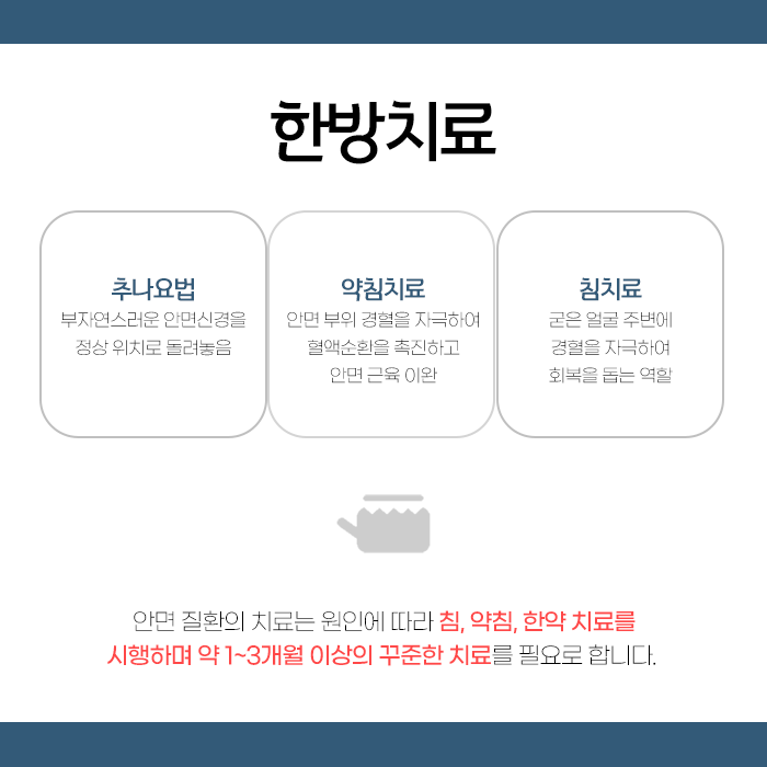 전주안면경련 증상의 원인을 해소하고 혈류 흐름을 정상적인 상태로 되돌리기 위해 다양한 한방치료를 적용하고 있습니다. 얼굴 주변의 특정 혈 자리에 가느다란 침을 놓아 기혈 순환을 촉진하고 안면 신경 기능을 활성화하여 염증을 가라앉히고 신경 재생을 돕습니다. 감사합니다.