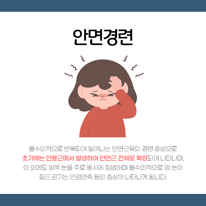 하지만 전주안면경련은 특성상 시간이 지날수록 증상이 점차 심해지고 범위가 넓어지는 경향이 있습니다. 처눈꺼풀에서 시작된 떨림이 뺨, 턱, 목까지 퍼져 얼굴 전체의 절반이 움찔거리는 상태로 진행될 수 있습니다.