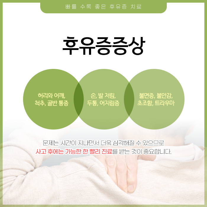 교통사고를 겪은 후 몸에 지속적인 불편함이나 통증이 느껴져 영상 검사를 받아보지만 뼈나 주요 장기 등에 별다른 이상이 없다는 결과를 듣게 되는 경우가 있습니다. 하지만 그럼에도 불구하고 통증이나 다른 불편함이 계속되어 답답함을 느끼시는 분들이 계십니다. 시간이 지날수록 불편함이 심해지고 사고 후유증으로 인해 몸과 마음이 지치기도 합니다.