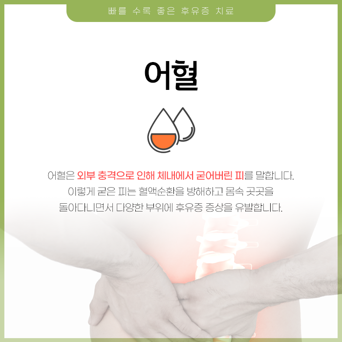 어혈은 한번 생기면 몸 스스로의 회복력만으로는 저절로 완전히 사라지지 않고 몸 안에 남아 후유증을 유발하거나 만성화시키는 경우가 많습니다. 사고는 예상치 못한 순간에 갑작스럽게 발생하기 때문에 충돌 시 몸이 크게 흔들리거나 뒤틀리면서 근골격계에 강한 충격이 전달됩니다.