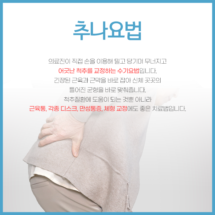 추나요법은 척추나 관절 통증을 완화하는 것을 넘어 몸 전체의 균형을 되찾아 다양한 질환에 효과적으로 사용되는 치료법입니다. 손을 이용한 치료 방식이라 부작용 위험이 적고 안전하게 받을 수 있다는 점이 장점입니다. 개인마다 통증 정도, 회복력이 다르기 때문에 치료 기간과 횟수에도 차이가 발생할 수 있습니다.
