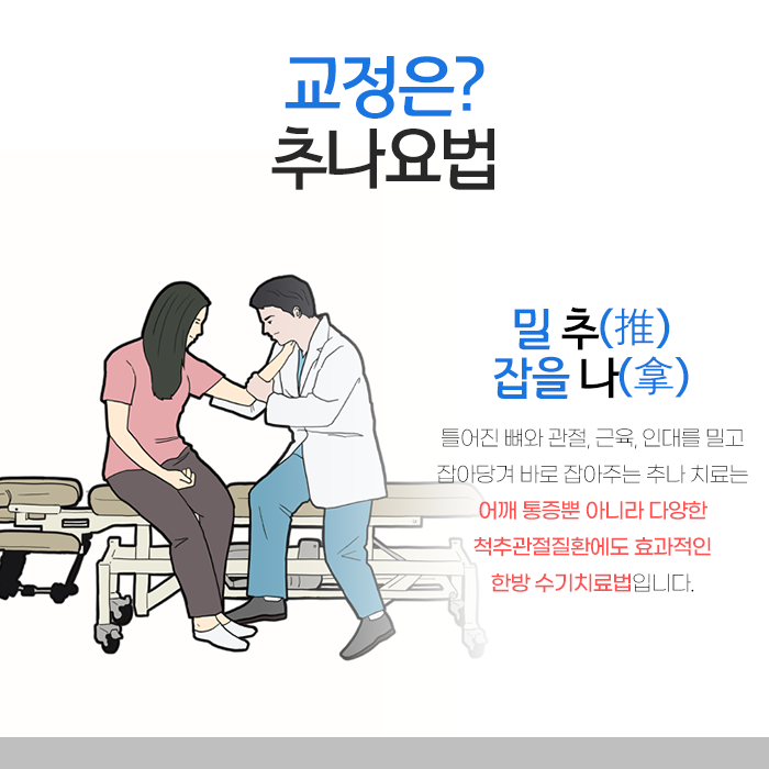 추나요법은 비뚤어진 목과 어깨 관절, 척추와 관절들을 세심하게 진단하고 조정하여 올바른 위치로 되돌려 주는 수기치료입니다. 삐뚤어진 척추와 관절이 제자리로 돌아오면서 굽은 자세가 자연스럽게 개선되고 부드럽게 풀리며 약화되어 있던 반대쪽 근육은 다시 활성화되어 제 기능을 되찾을 수 있도록 돕습니다. 전주효자동라운드숄더 개선은 이러한 조정 요법의 치료 효과입니다. 추나요법 외에도 한방요법을 병행하여 치료를 시행해야합니다. 감사합니다.