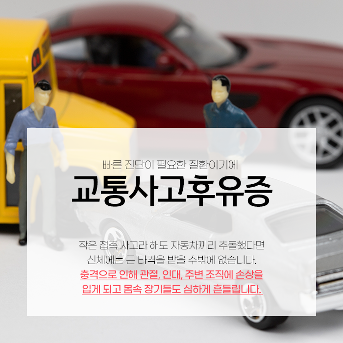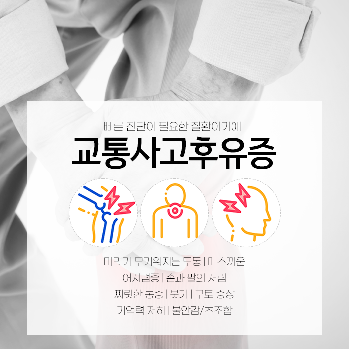 긴장이 풀리고 피로가 누적되면서 면역력이 떨어질 때 그동안 숨어 있던 통증과 기능 이상이 겉으로 드러나는 것입니다. 사고 후 후유증은 목이나 허리 같은 근골격계 통증으로만 나타나지 않습니다.