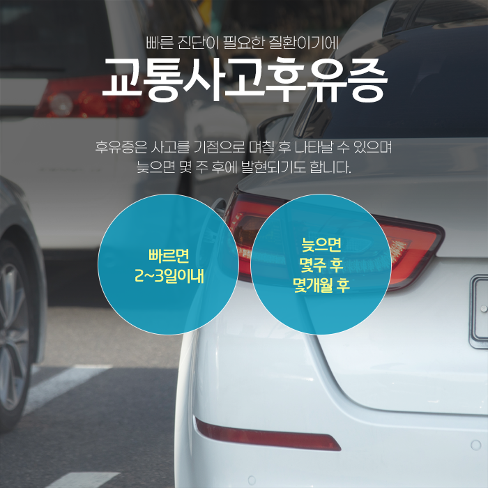 비록 육안으로 확인하기에 외상이 없거나 당장 별다른 아픔이 느껴지지 않는다고 해서 특별한 조치 없이 복귀하거나 신체 건강 관리에 소홀해서는 안 됩니다. 사고 직후 외상이 없거나 뚜렷한 통증이 느껴지지 않더라도 곧바로 일상으로 복귀하거나 신체 관리에 소홀한 것은 바람직하지 않습니다. 교통사고 후유증은 바로 나타나지 않고 일정한 잠복기를 거쳐 발현되는 경우가 많습니다.